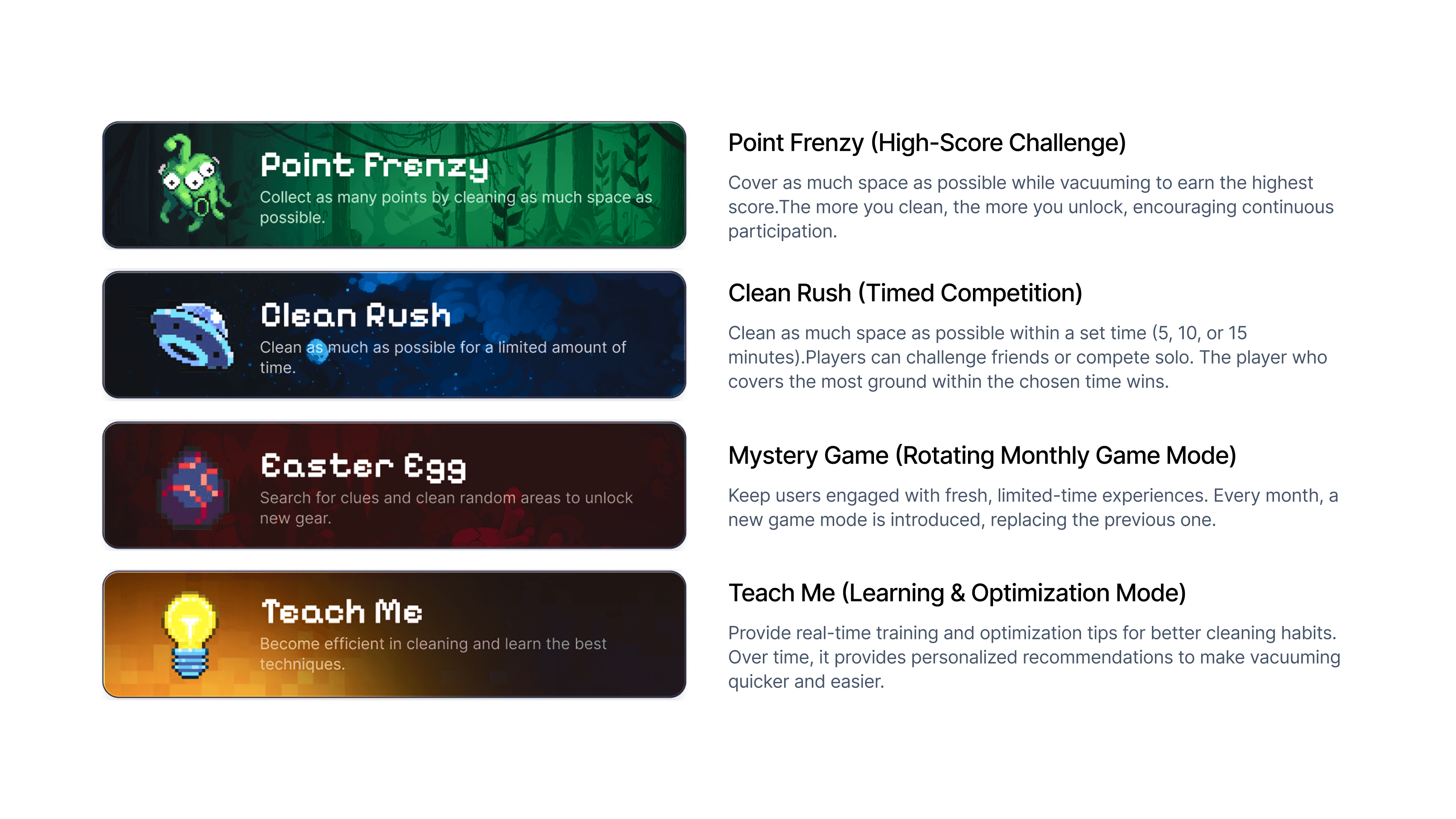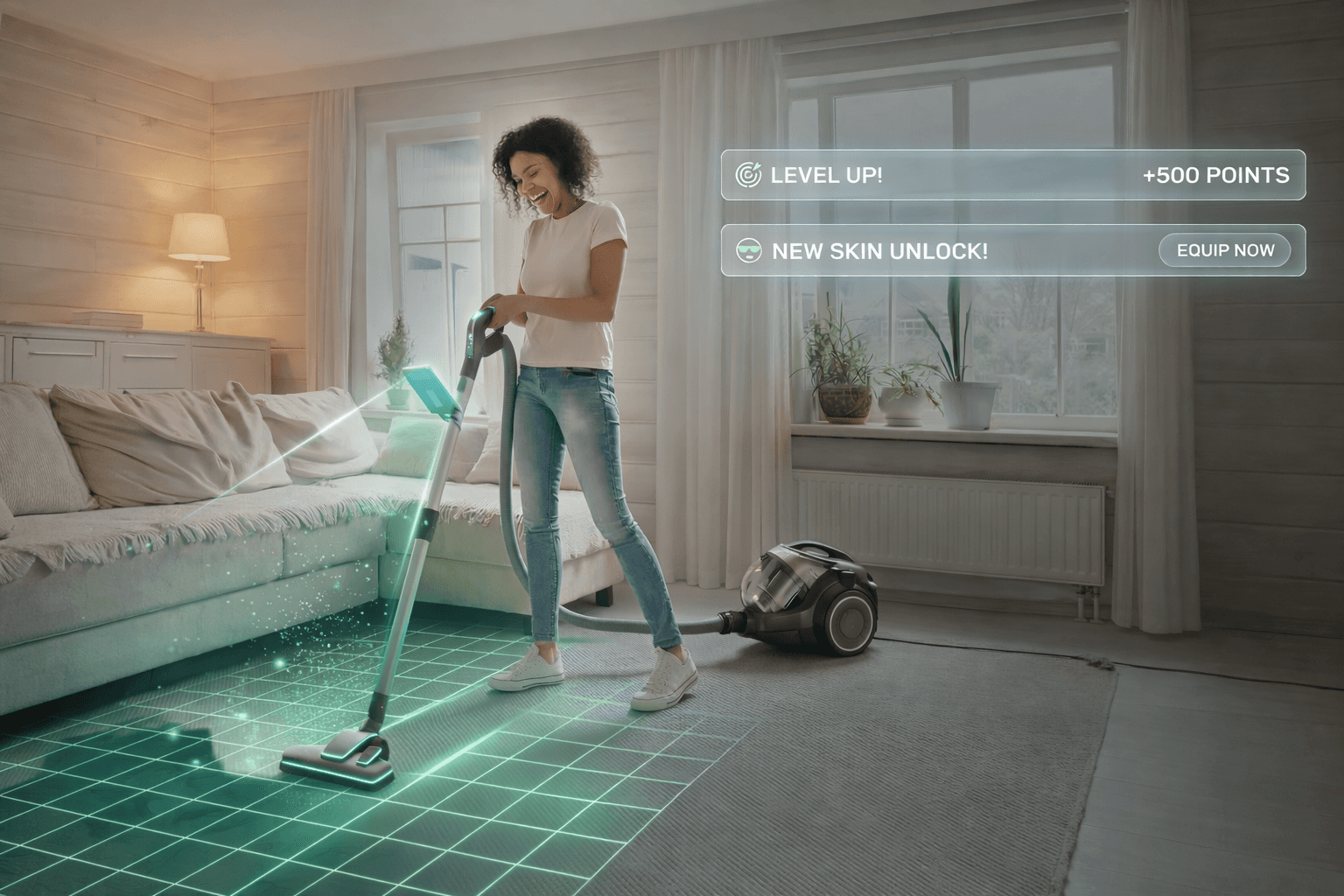 By combining physical product design with game mechanics, it transforms vacuuming from a chore into a rewarding activity.