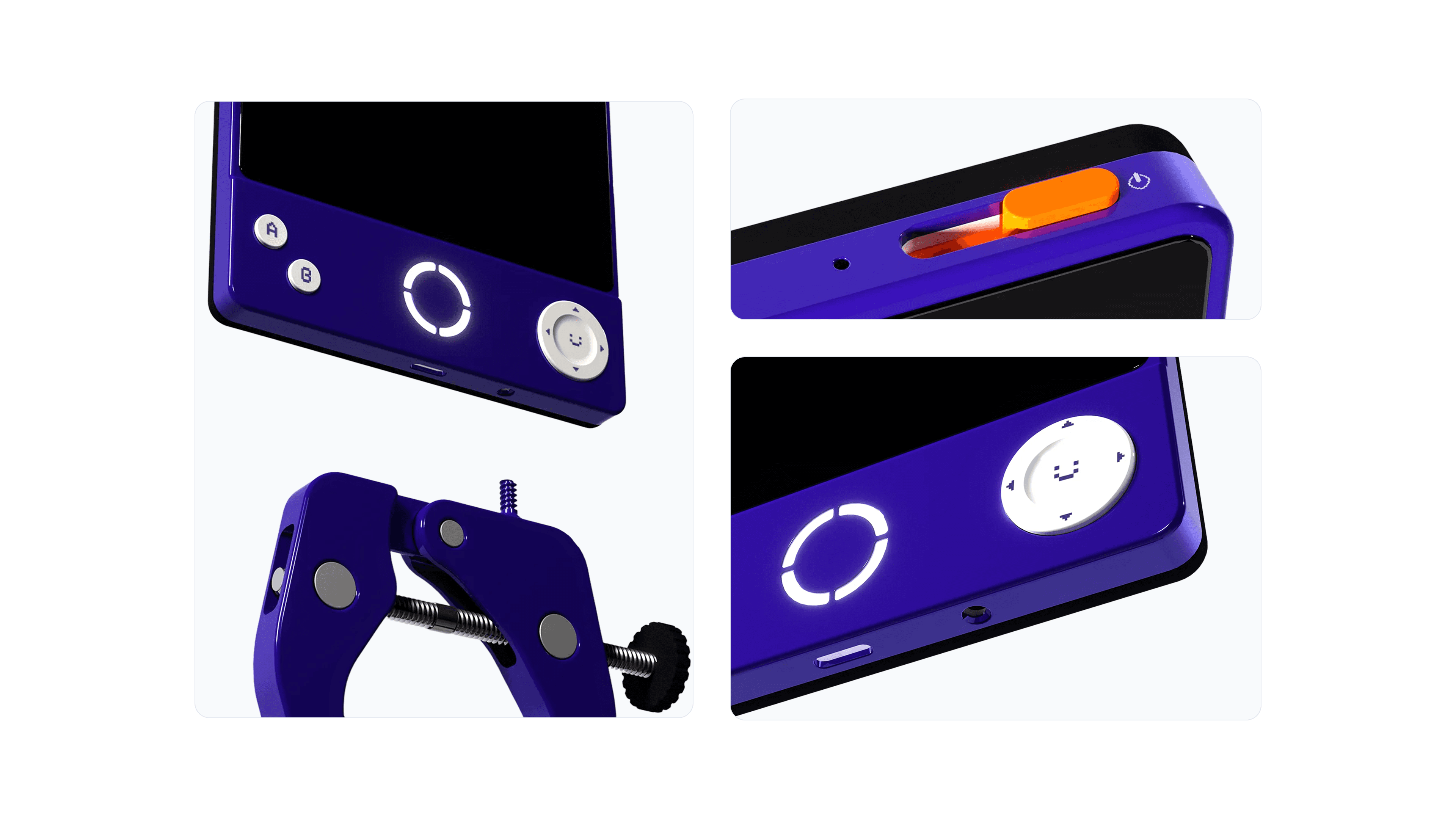 The top module integrates a display, two primary action buttons (A/B), and an analog directional control.